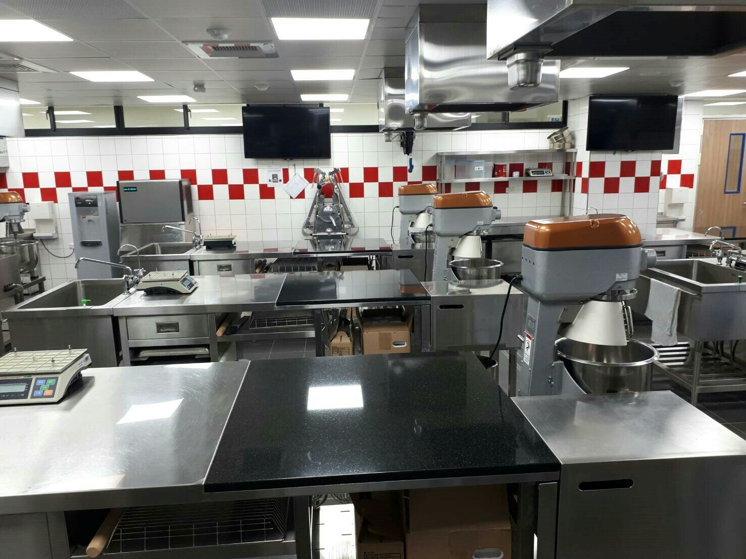 工欲善其事必先利其器~給您TOP1上課環境(即測即評考場)設備:工作檯、蒸氣烤箱、攪拌機 、桌上型攪拌機、冷凍冰箱、冷藏冰箱、急速冷凍、丹麥機、壓麵機、切麵機、電磁爐、水果低溫風乾機、拉糖機、三環爐、平底煎鍋。